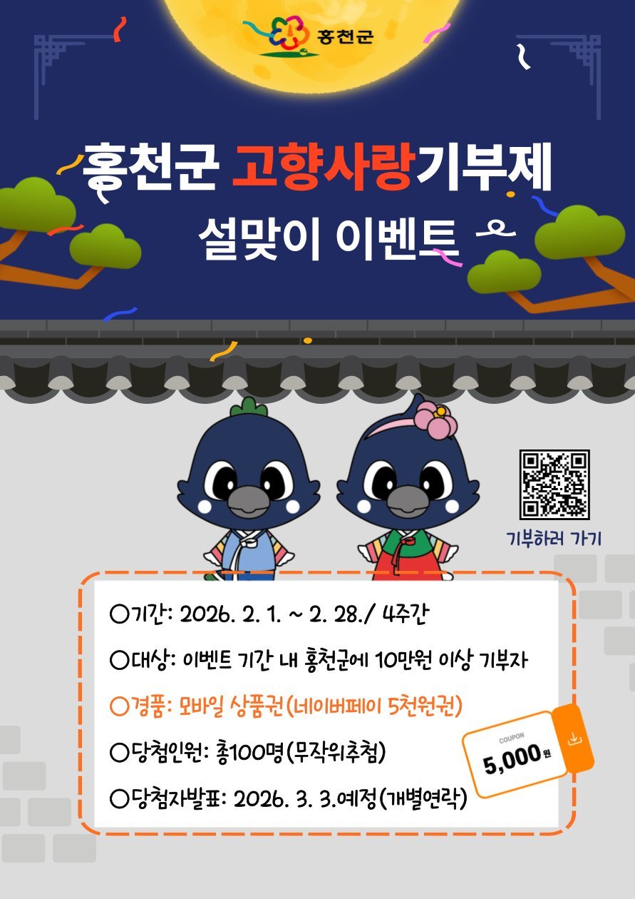 [한국Q뉴스] 홍천군은 2026년 설 명절을 맞아 고향사랑기부제의 활성화와 건전한 기부 문화 확산을 위해 ‘설맞이 고향사랑기부제 이벤트’를 진행한다.