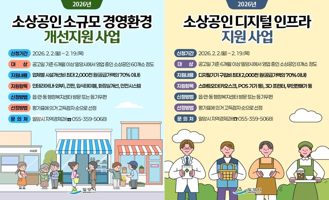 [한국Q뉴스] 경남 밀양시는 관내 소상공인의 자생력을 강화하고 경영 안정을 돕기 위해 2026년 소상공인 지원사업을 추진한다.