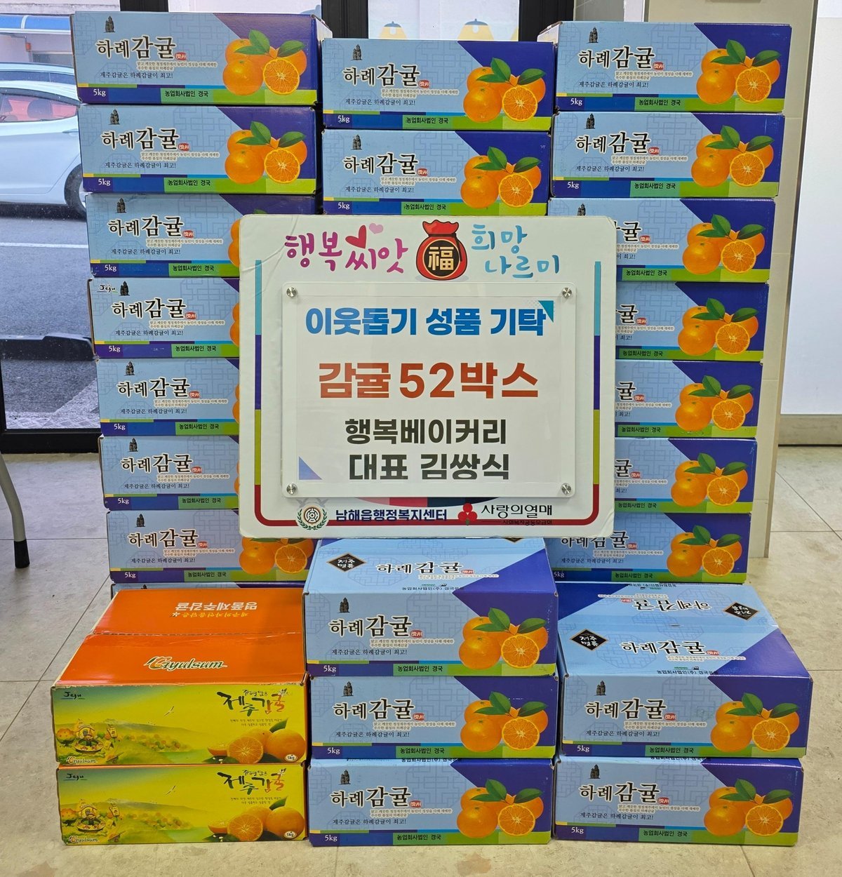 [한국Q뉴스] 남해읍소재 행복베이커리 김쌍식 대표가 지난 2일 지역 내 어려운 이웃을 돕기 위해 감귤 52박스를 남해읍행정복지센터에 기탁했다 이번에 기부된 감귤은 남해읍 관내 경로당 32개소와 남해자활센터에 전달되어 어르신들과 취약계층의 건강한 겨울나기를 돕는 데 사용될 예정이다.