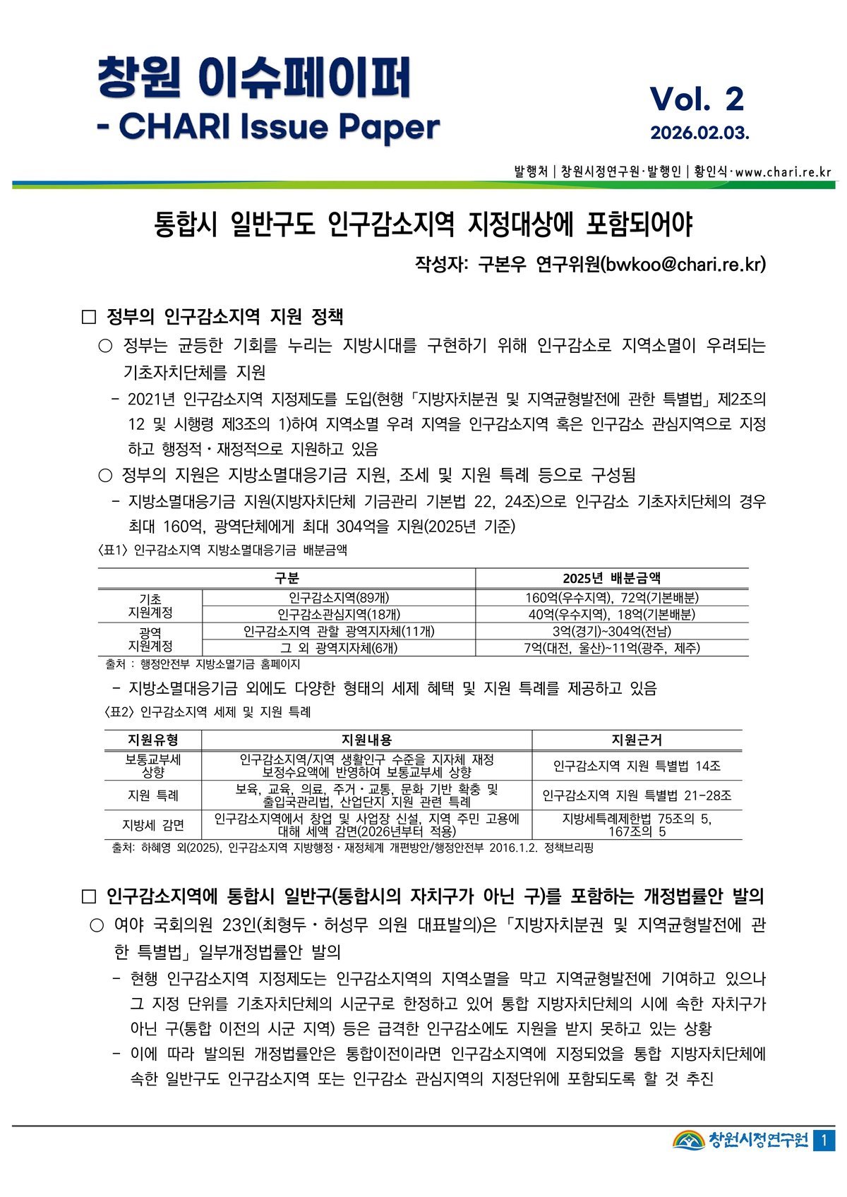 이번 창원 이슈페이퍼는 인구감소지역 지정대상에 통합시 일반구를 포함시키는 내용을 담은 개정법률안 발의 이슈를 다뤘다.
