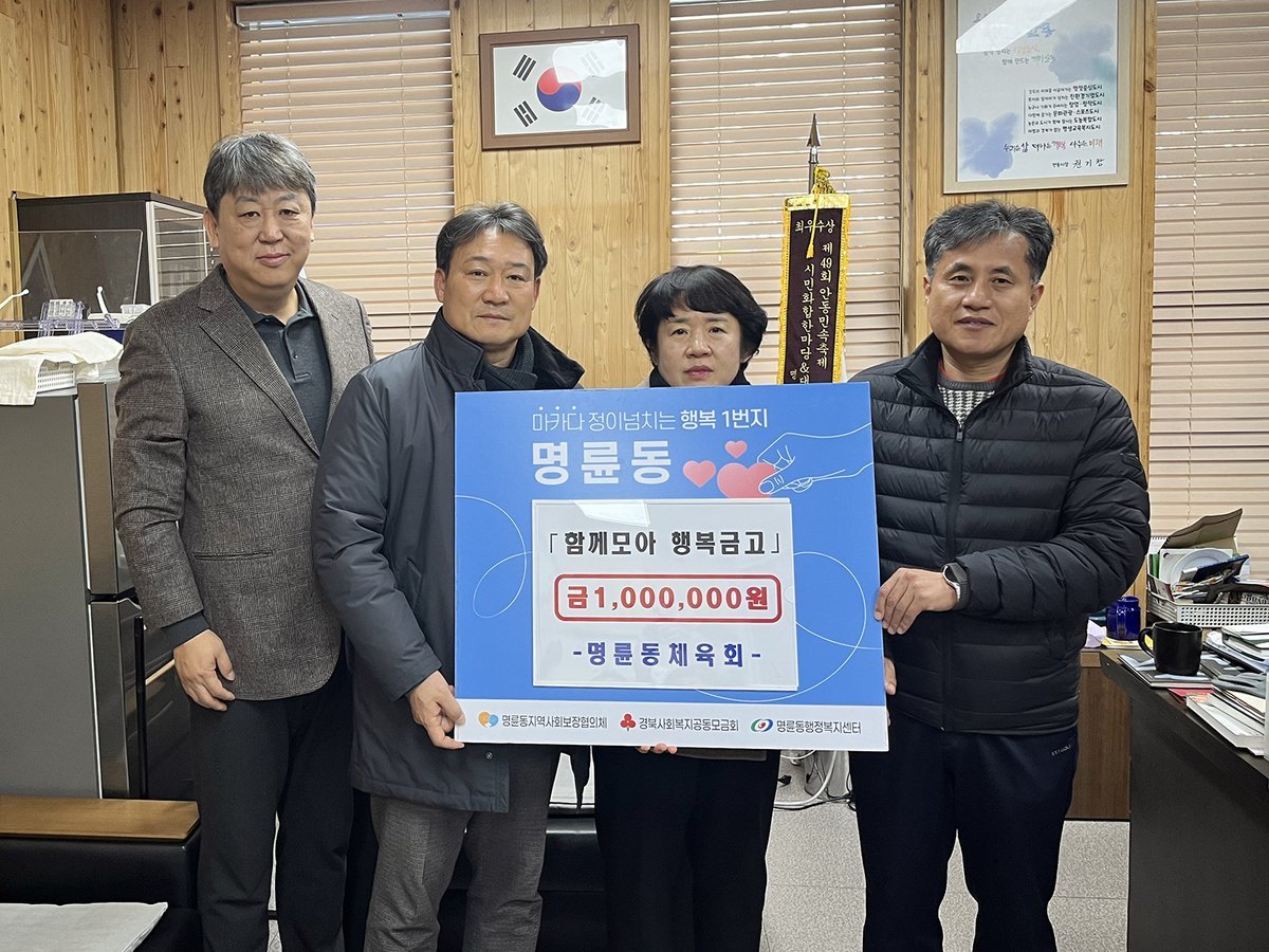 [한국Q뉴스] 안동시 명륜동 체육회는 2월 3일 명륜동행정복지센터를 방문해 관내 어려운 이웃을 돕는 데 사용해 달라며 함께모아 행복금고에 성금 100만원을 기탁했다.