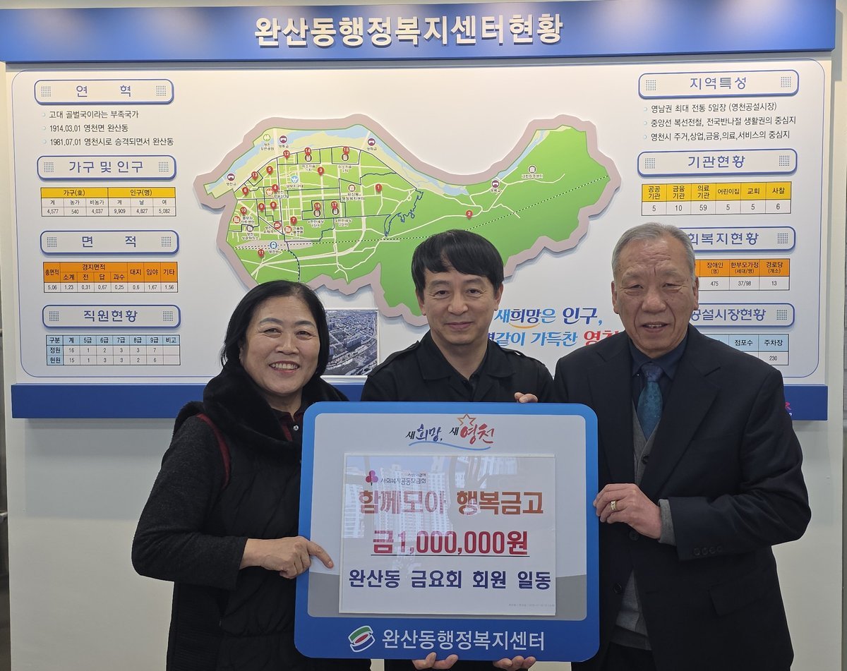 [한국Q뉴스] 영천시 완산동은 지난 3일 주요 기관·단체장으로 구성된 금요회에서 지역 내 어려운 이웃을 위해 써달라며 성금 100만원을 ‘함께모아 행복금고’에 기탁했다고 밝혔다.
