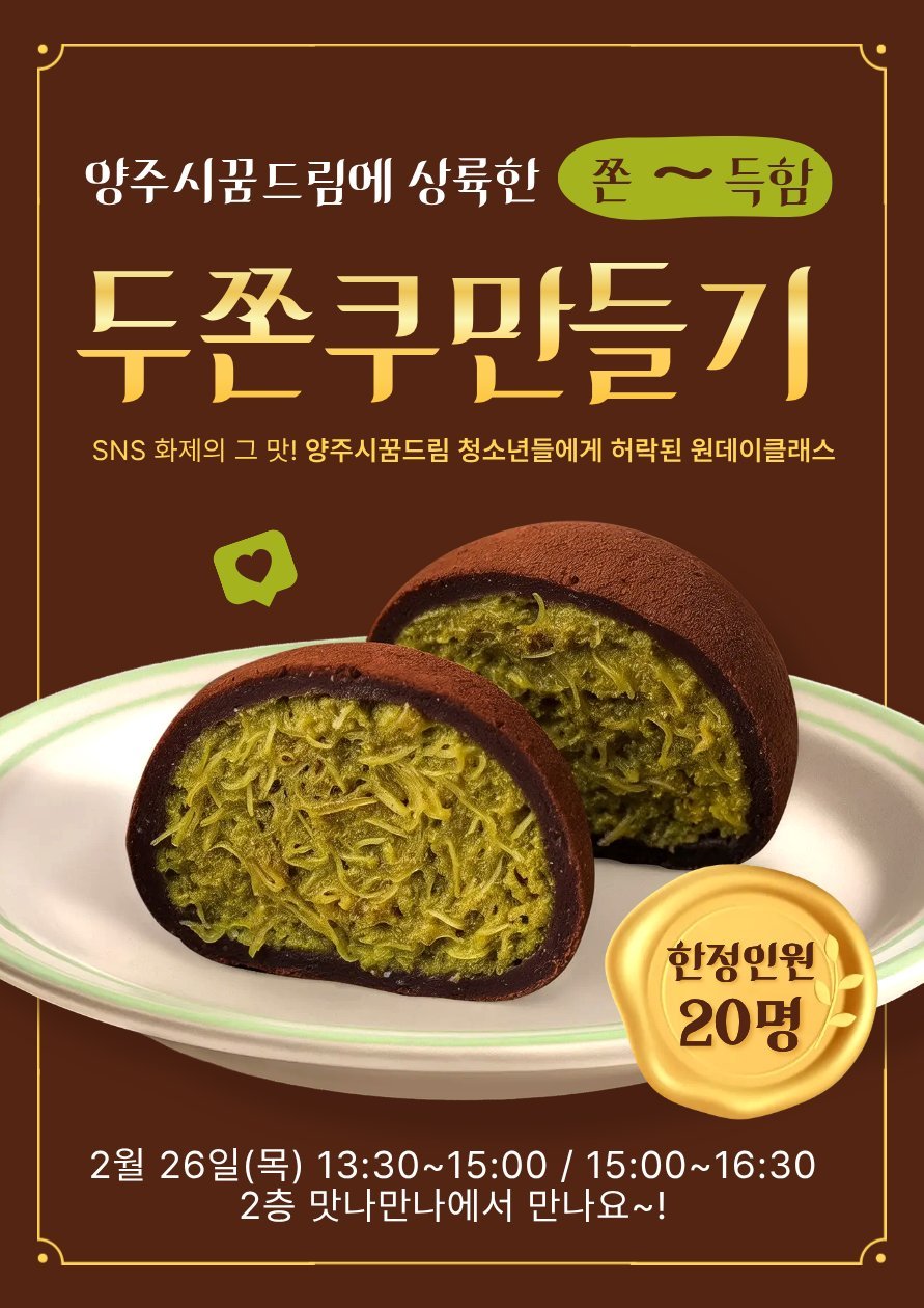 [한국Q뉴스] 양주시학교밖청소년지원센터는 지난 1월 청소년자치회의에서 나온 청소년들의 의견과 수요를 적극 반영해 '두바이쫀득쿠키 원데이클래스'를 오는 2월 25일 운영한다.
