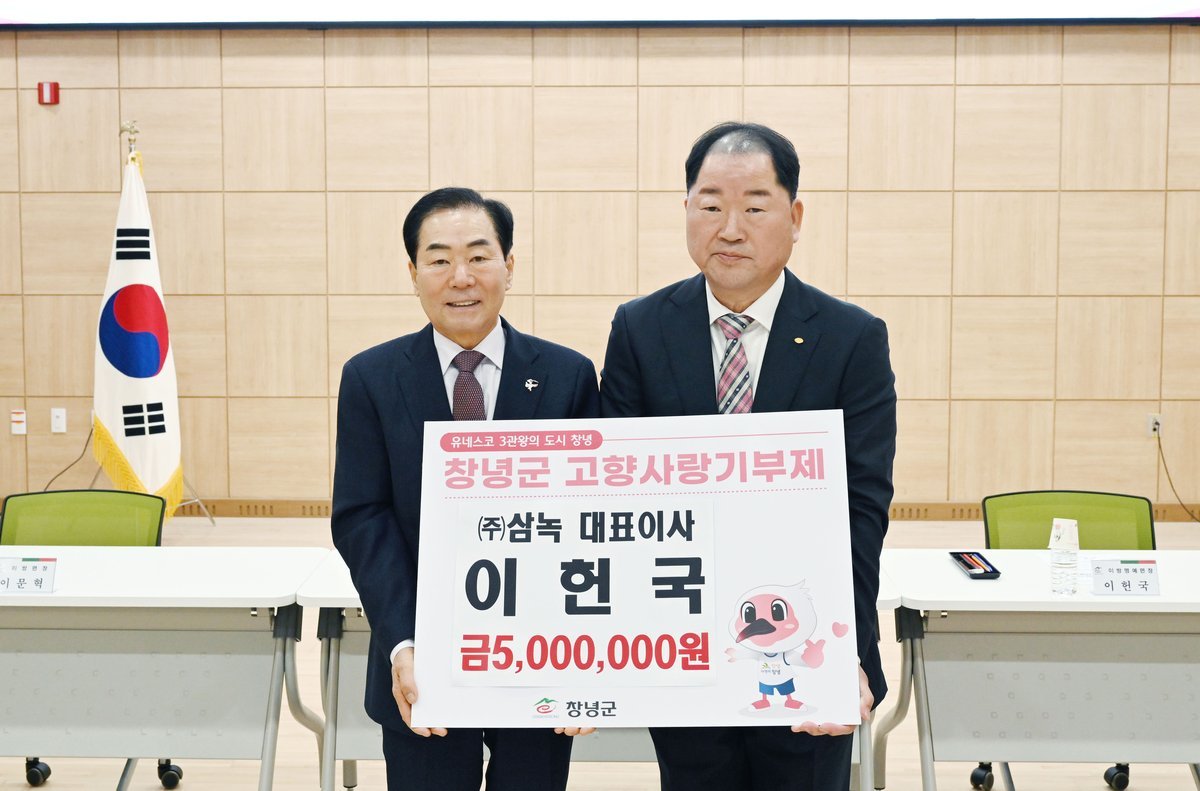 [한국Q뉴스] 창녕군은 3일 삼녹 이헌국 대표가 고향사랑기부금 500만원을 기탁했다고 밝혔다.