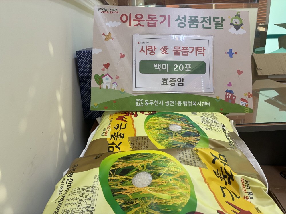 [한국Q뉴스] 동두천시 생연1동 행정복지센터는 지난 3일 효종암으로부터 설 명절을 맞아 어려운 이웃을 위한 백미 20포를 기탁받았다고 밝혔다.