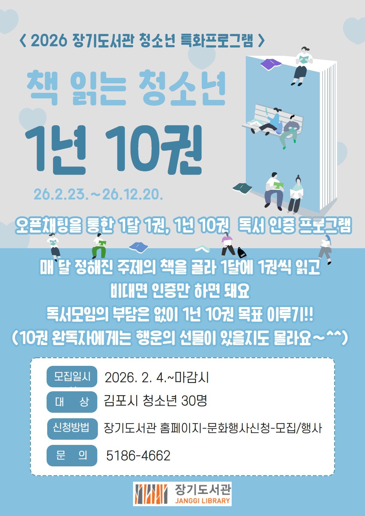 [한국Q뉴스] 김포시 장기도서관은 청소년의 자발적인 독서 습관 형성을 위해 청소년 특화프로그램 ‘책 읽는 청소년 1년 10권’을 오는 2월 23일부터 연말까지 운영한다.