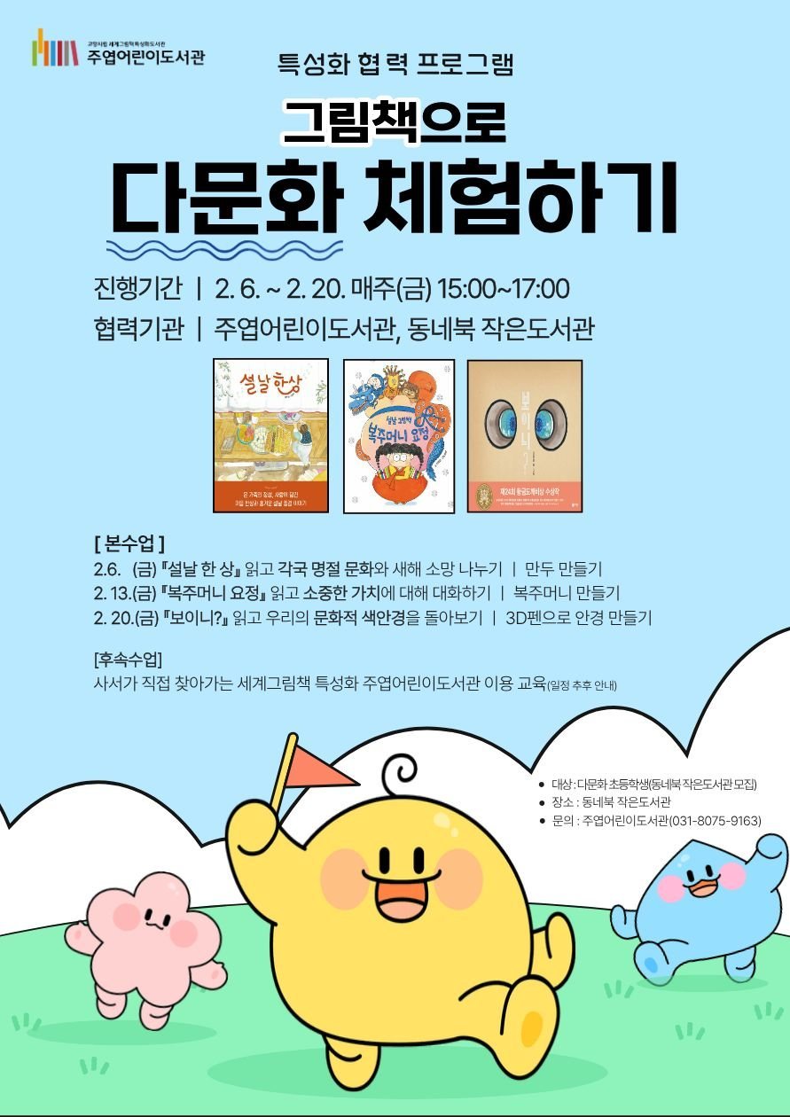 ‘그림책으로 다문화 체험하기’프로그램은 일산서구에 위치한 동네북 작은도서관에서 진행되며 자세한 사항은 주엽어린이도서관으로 문의하면 된다.