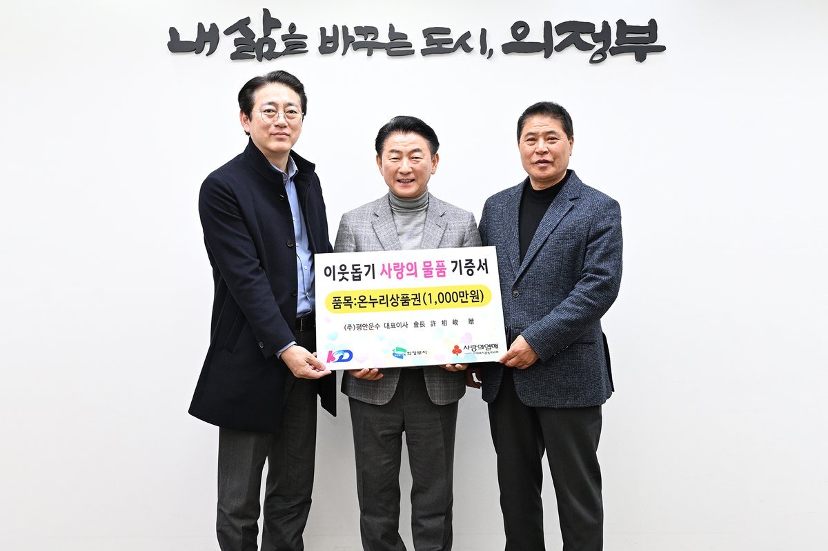 [한국Q뉴스] 의정부시는 2월 4일 KD운송그룹이 설 명절을 앞두고 어려운 이웃을 돕기 위해 1천만원 상당의 온누리상품권을 기탁했다고 밝혔다.