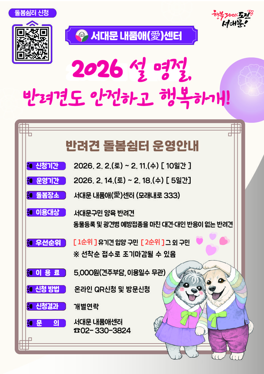 [한국Q뉴스] 서대문구가 설 연휴 기간 반려견 돌봄에 어려움이 있는 구민들을 위해 이달 14일 토요일부터 18일 수요일까지 닷새간 서대문 내품애센터에서 반려견 돌봄 쉼터를 운영한다.