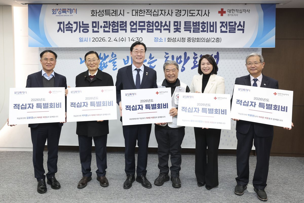[한국Q뉴스] 대한적십자사 화성특례시지부 시범 운영 추진 재난구호·취약계층 지원 등 지역 인도주의 사업 협력 2026년도 적십자 특별회비 전달식 함께 진행 화성특례시와 대한적십자사 경기도지사가 4일 화성시청에서 지속가능한 민·관협력 거버넌스 구축을 위해 업무협약을 체결했다.