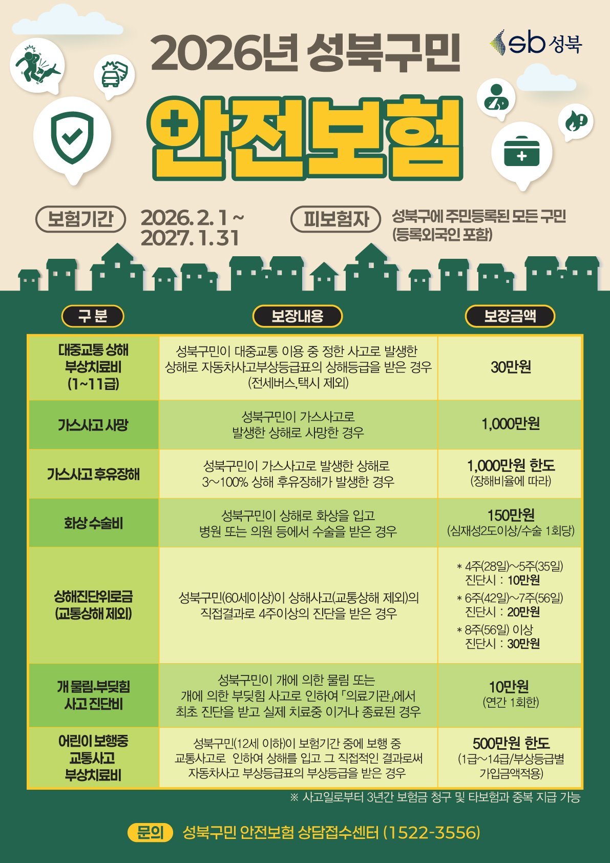 보험기간은 2026년 2월 1일부터 2027년 1월 31일까지 1년간이며 성북구에 주민등록이 된 모든 구민은 별도의 가입 절차 없이 자동 가입된다.