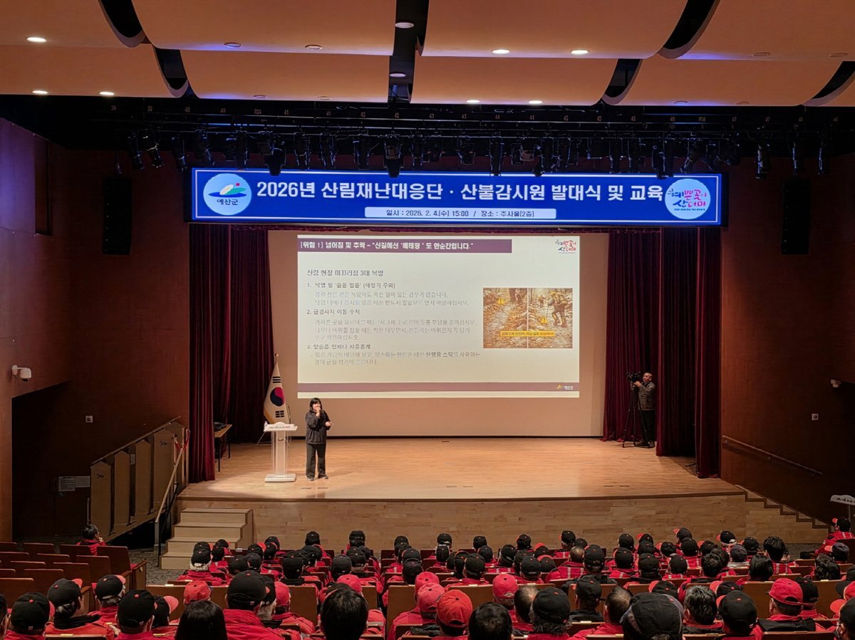 [한국Q뉴스] 예산군은 산불 등 산림재난에 선제적으로 대응하기 위해 지난 4일 추사홀에서 ‘2026년 산림재난대응단 및 산불감시원 발대식’을 개최하고 본격적인 산불 예방·대응 활동에 돌입했다.