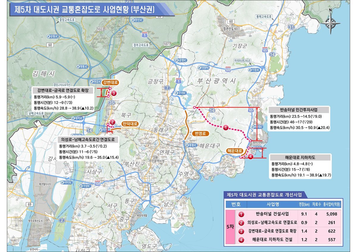 해운대 센텀2지구~오시리아 관광단지 간 직결로 부산시 외곽 순환도로망을 완성하는 터널을 신설하여 통행시간을 대폭 단축하고, 고속도로 입구와 접속도로 병목구간의 교통혼잡을 해소한다.