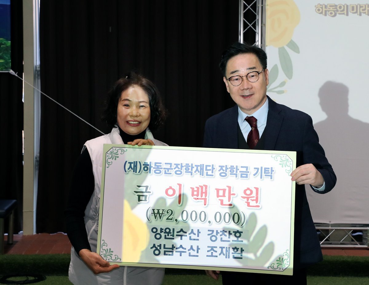 하동군장학재단은 지난 4일 금남면 면정보고회 현장에서 양원수산 강찬호 대표와 성남수산 조재환 대표가 함께 지역 청소년들을 위한 장학기금 200만원을 전달했다고 밝혔다.