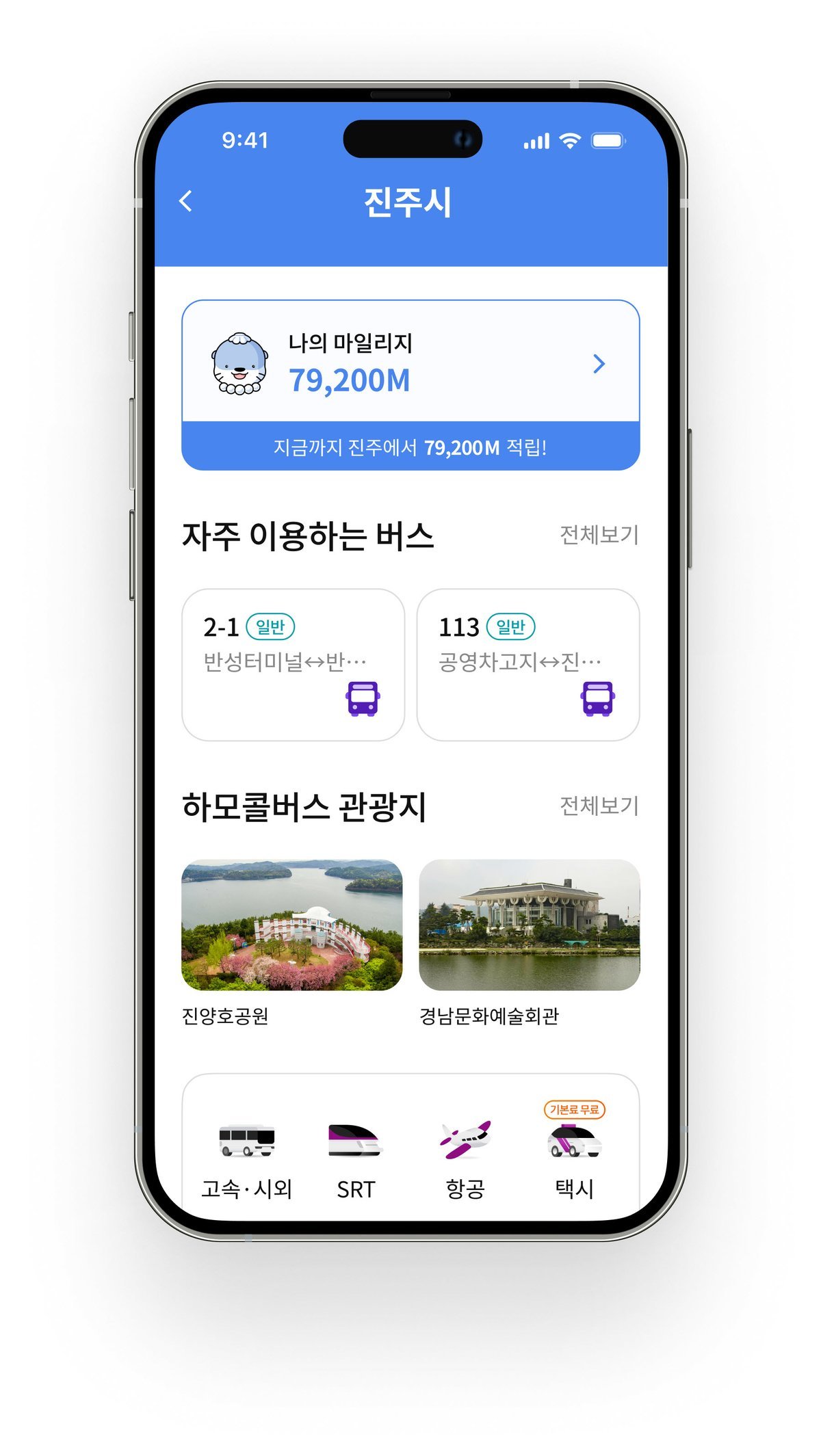 또한 서울과 경기, 대전에서 진주를 관광 또는 업무 목적으로 오고 갈 때에도 ‘티머니GO’를 이용하면 환승할 때마다 1650원의 광역 환승 마일리지의 적립을 받을 수 있다.