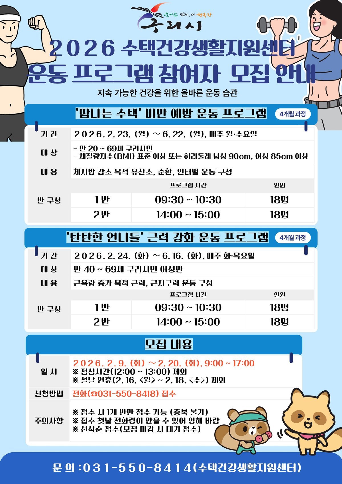 [한국Q뉴스] 구리시 수택건강생활지원센터는 오는 2월 9일부터 성인과 중장년층의 비만 예방과 근력 강화를 위한 맞춤형 운동프로그램인 '땀나는 수택'과 '탄탄한 언니들'의 참여자를 모집한다고 밝혔다.