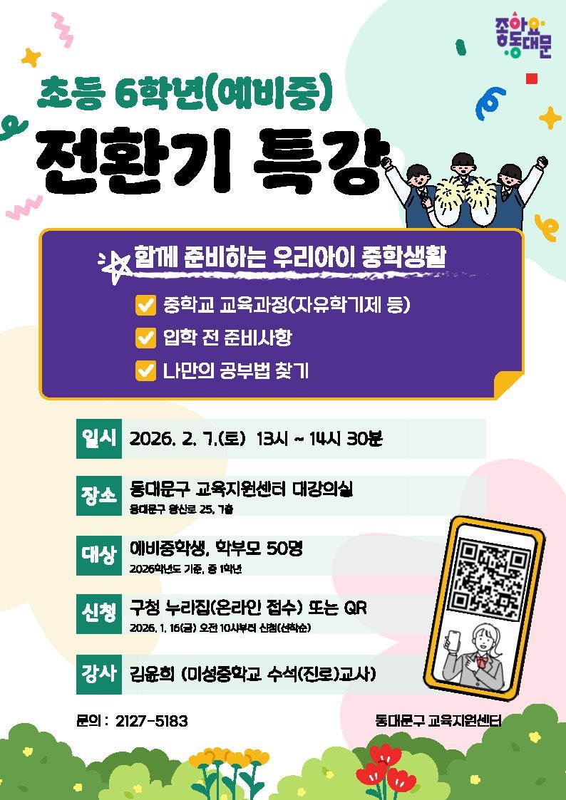 이필형 동대문구청장은 "전환기 교육은 학생들의 학교생활 적응과 진로 설계에 매우 중요한 과정"이라며 "이번 프로그램을 통해 학생들이 겪을 혼란을 줄이고 변화하는 교육환경 속에서도 스스로 방향을 설정하며 안정된 학교생활을 이어갈 수 있는 힘을 기를 수 있기를 기대한다"고 밝혔다.