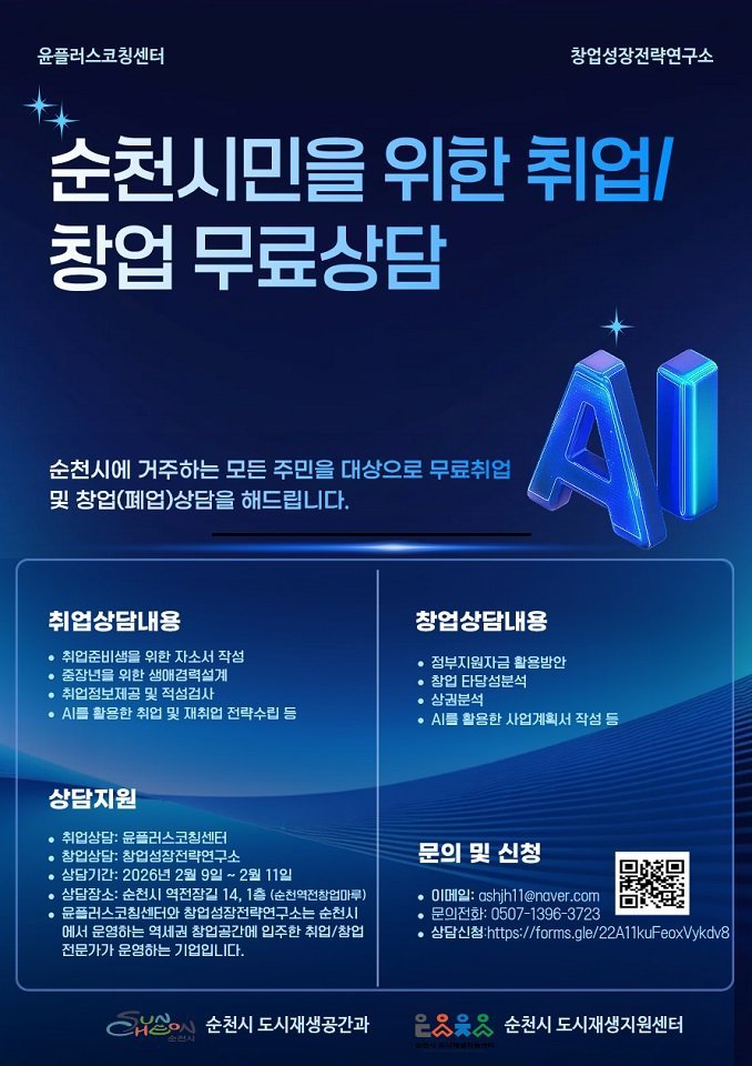 이번 상담은 오는 9일부터 11일까지 3일간, 순천역전 창업마루 1층에서 진행되며 지역주민과 창업자, 청년, 학생 등을 대상으로 맞춤형 전문상담을 제공한다.