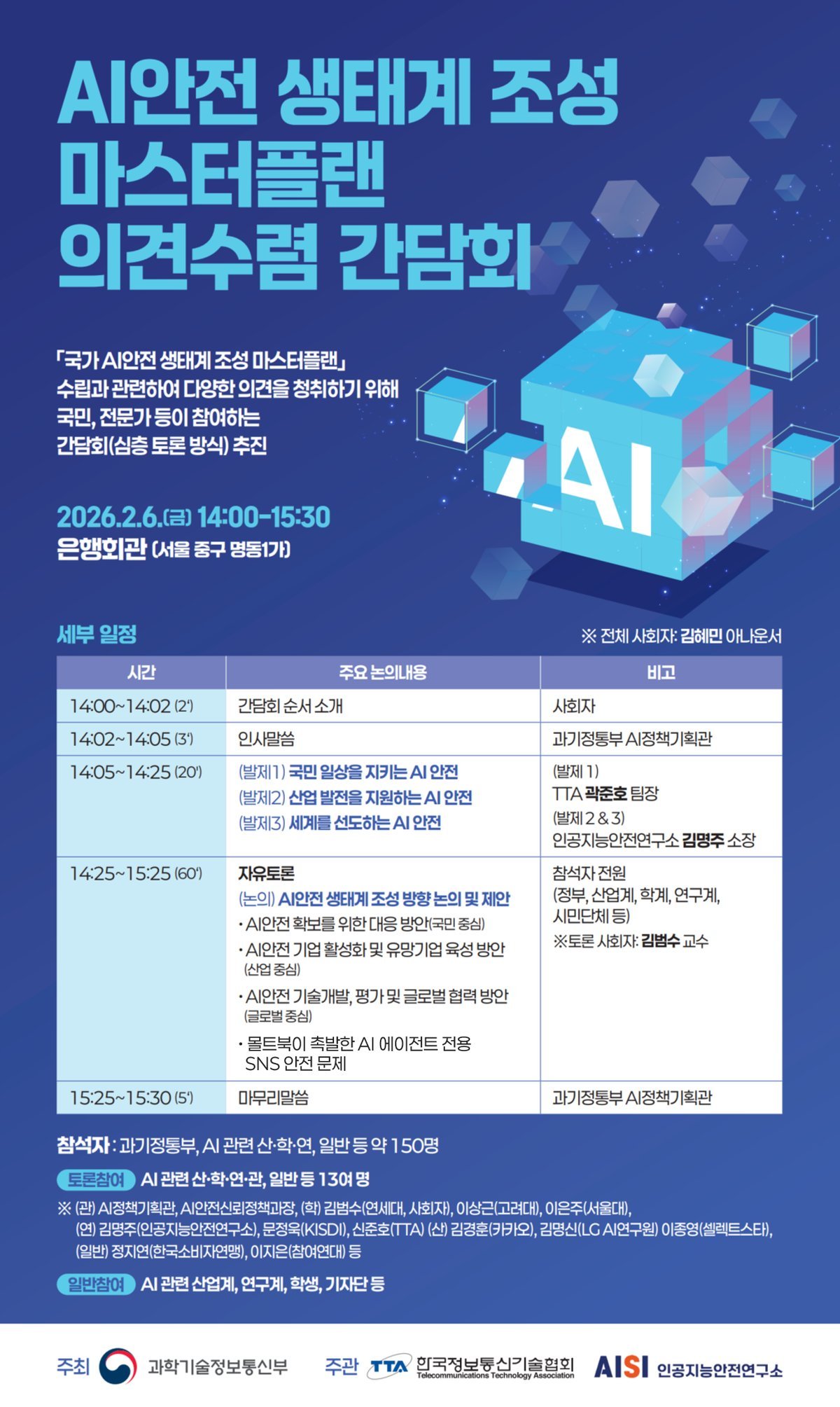 [한국Q뉴스] 과학기술정보통신부가 주최하고 한국정보통신기술협회와 인공지능 안전연구소가 주관하는「국가 인공지능 안전 생태계 조성 종합계획」 의견수렴 간담회를 2월 6일 14시 서울 중구 은행회관 국제회의실에서 개최한다고 밝혔다.