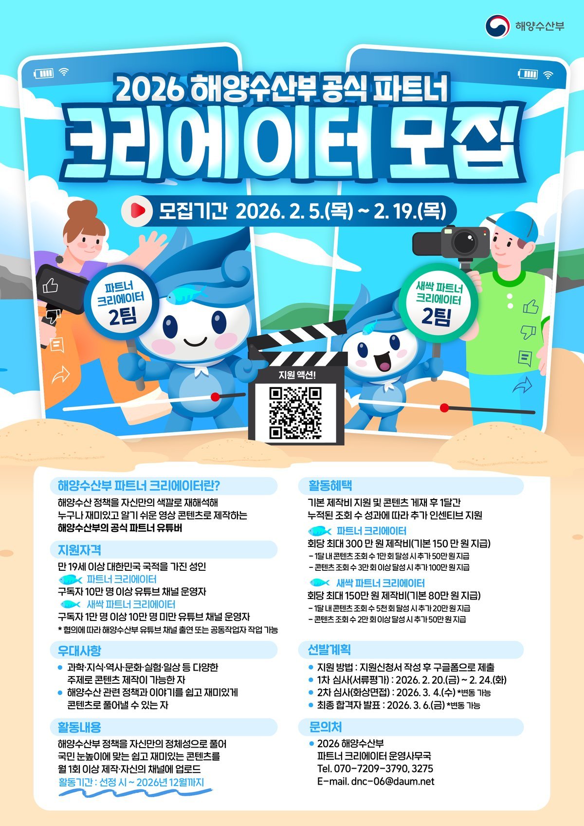 [한국Q뉴스] 해양수산부는 2026년 한 해 동안 해양수산 정책을 국민 눈높이에 맞춰 쉽고 재미있게 전달해 줄 ‘2026 해양수산부 공식 영상 협력 제작자’를 2월 5일부터 2월 19일까지 모집한다고 밝혔다.