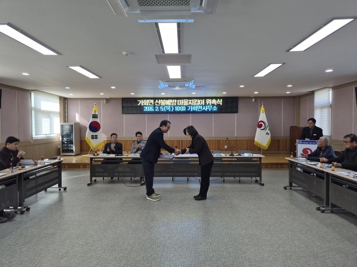 [한국Q뉴스] 합천군 가회면은 2월 5일 오전 10시, 가회면사무소 2층 회의실에서 '산불예방 마을지킴이 위촉식'을 개최하고 관내 이장 24명을 마을지킴이로 위촉했다.