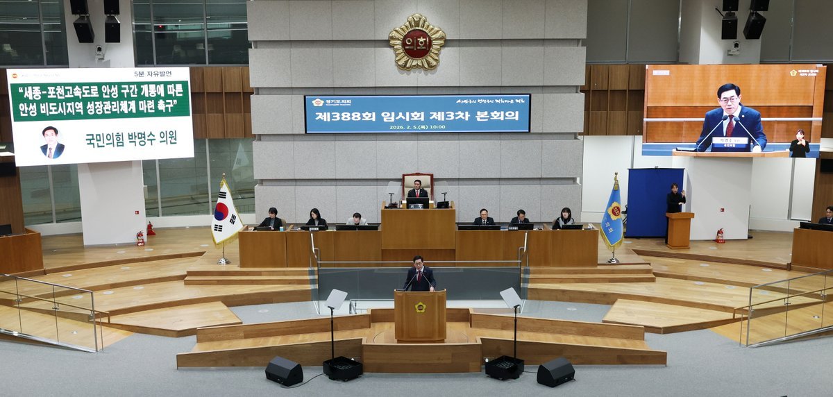 [한국Q뉴스] 경기도의회 도시환경위원회 박명수 의원은 5일 열린 제388회 임시회 본회의 5분 자유발언을 통해 세종~포천고속도로 안성 구간 개통 이후 급증하는 개발 수요에 대비한 비도시지역 성장관리체계 부재 문제를 지적하며 경기도의 선제적 대응과 책임 있는 정책 결단을 촉구했다.