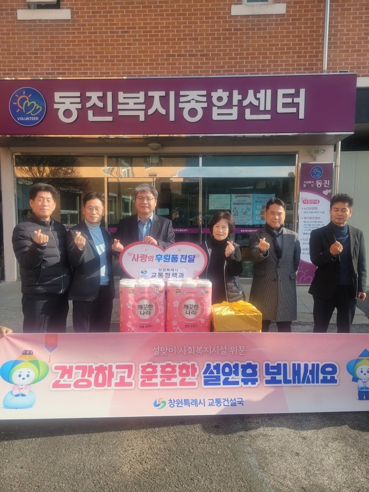 [한국Q뉴스] 창원특례시 교통건설국은 다가오는 민족 고유의 명절 설을 맞아, 5일 의창구 동읍에 위치한 '동진노인복지시설'을 방문해 위문품을 전달하고 따뜻한 정을 나누는 시간을 가졌다고 밝혔다.
