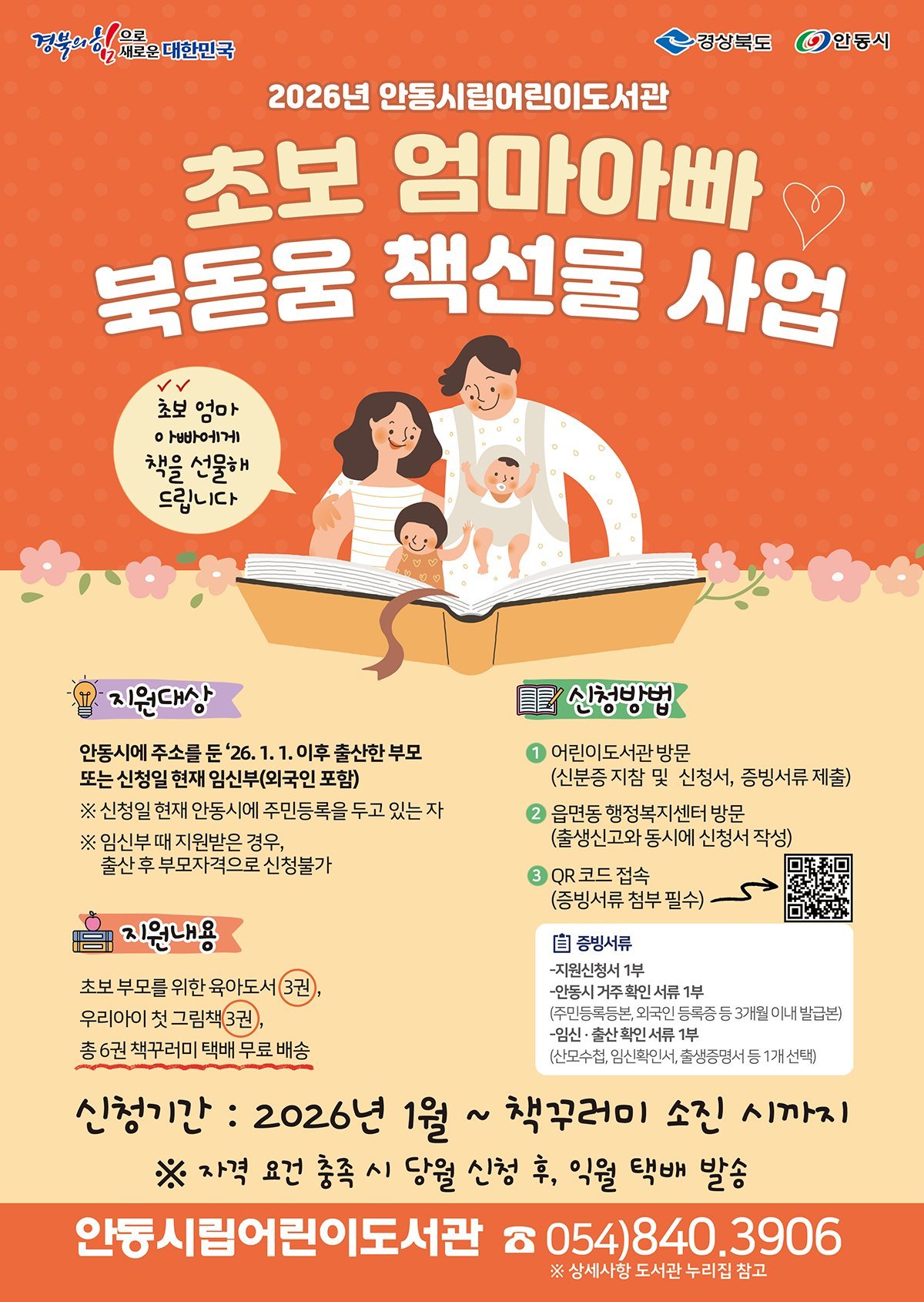 신청 대상은 안동시에 주소를 두고 2026년 1월 1일 이후 출산한 부모 또는 신청일 현재 임신부이며 신청 방법은 △읍․면․동 행정복지센터에서 출생신고와 동시에 신청서 작성 △안동시립어린이도서관 방문 후 증빙서류 제출 △시립도서관 누리집과 홍보물 QR코드를 통한 온라인 신청 중 선택하면 된다.