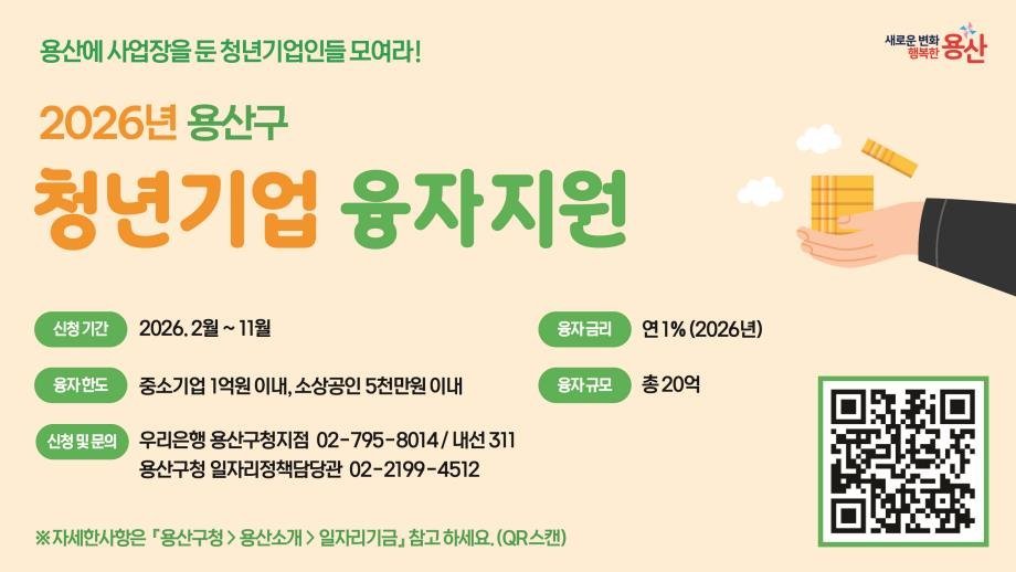 융자 신청서와 관련 서류, 기타 자세한 사항은 용산구 누리집 내 '용산소개 '구정소식 '고시 / 공고 또는 일자리기금 '게시글 '2026년 청년기업 융자지원 '에서 확인하고 내려받을 수 있다.
