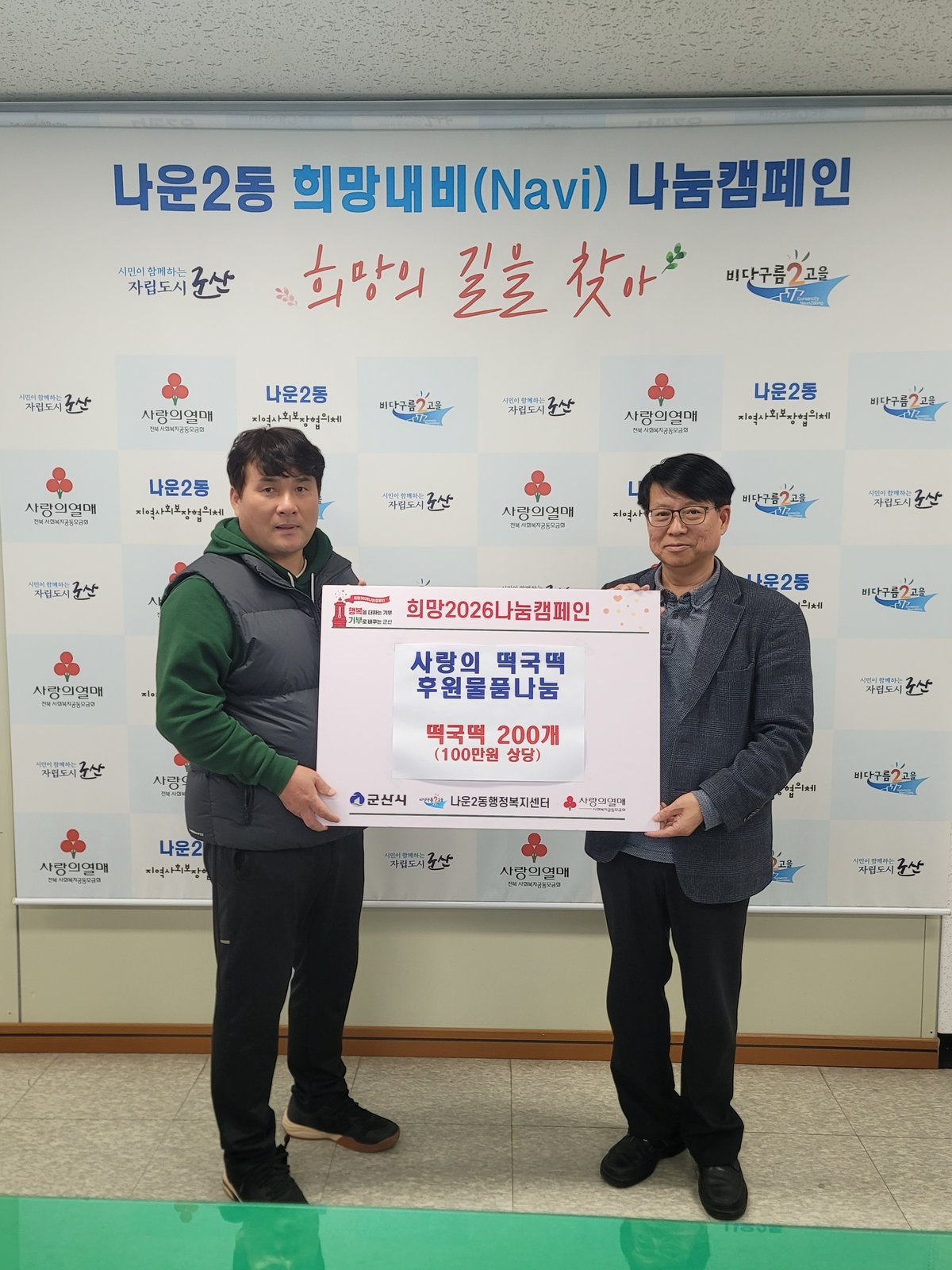 [한국Q뉴스] 군산시 나운2동 행정복지센터는 6일 민모터스·민하우스·아우어인어스를 운영하는 손기환 대표가 100만원 상당의 떡국 떡 200팩을 ‘행복나눔 공유곳간’에 기탁했다고 밝혔다.