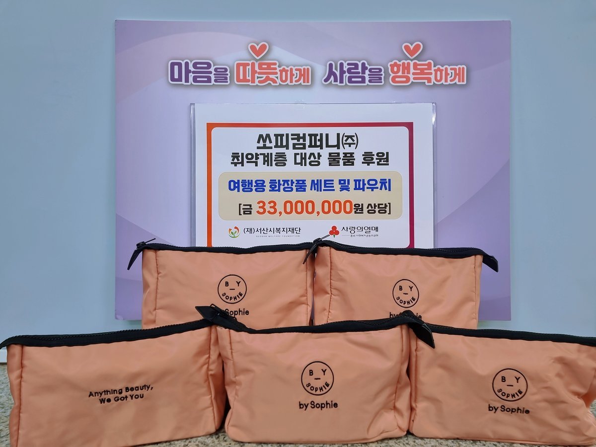 [한국Q뉴스] 쏘피컴퍼니는 지난 2월 5일 서산시복지재단에 화장품 세트 및 파우치 450여 개을 기탁하며 지역사회 나눔을 실천했다.