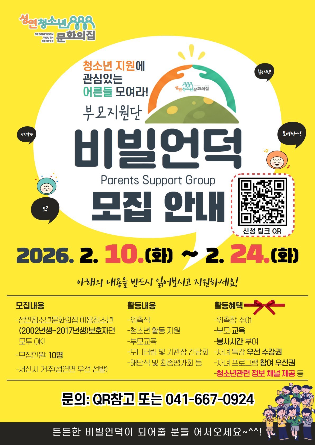 [한국Q뉴스] 성연청소년문화의집은 2026년 한 해 동안 지역 청소년의 건강한 성장과 안정적인 발달을 지원하기 위해 청소년 보호자를 대상으로 부모지원단 '비빌언덕'참여자를 2월 10일부터 2월 24일까지 모집한다고 밝혔다.