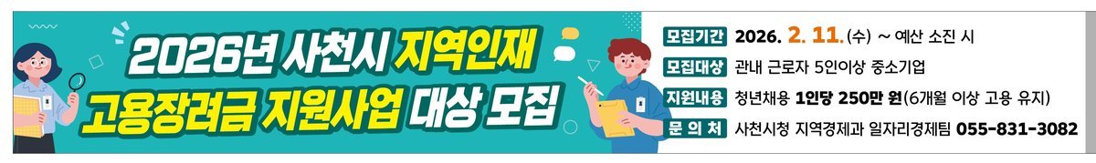 [한국Q뉴스] 사천시는 청년 취업난과 중소기업체의 인력난 해소를 위해 2026년 사천시 지역인재 고용장려금 지원사업 참여기업을 모집한다고 6일 밝혔다.