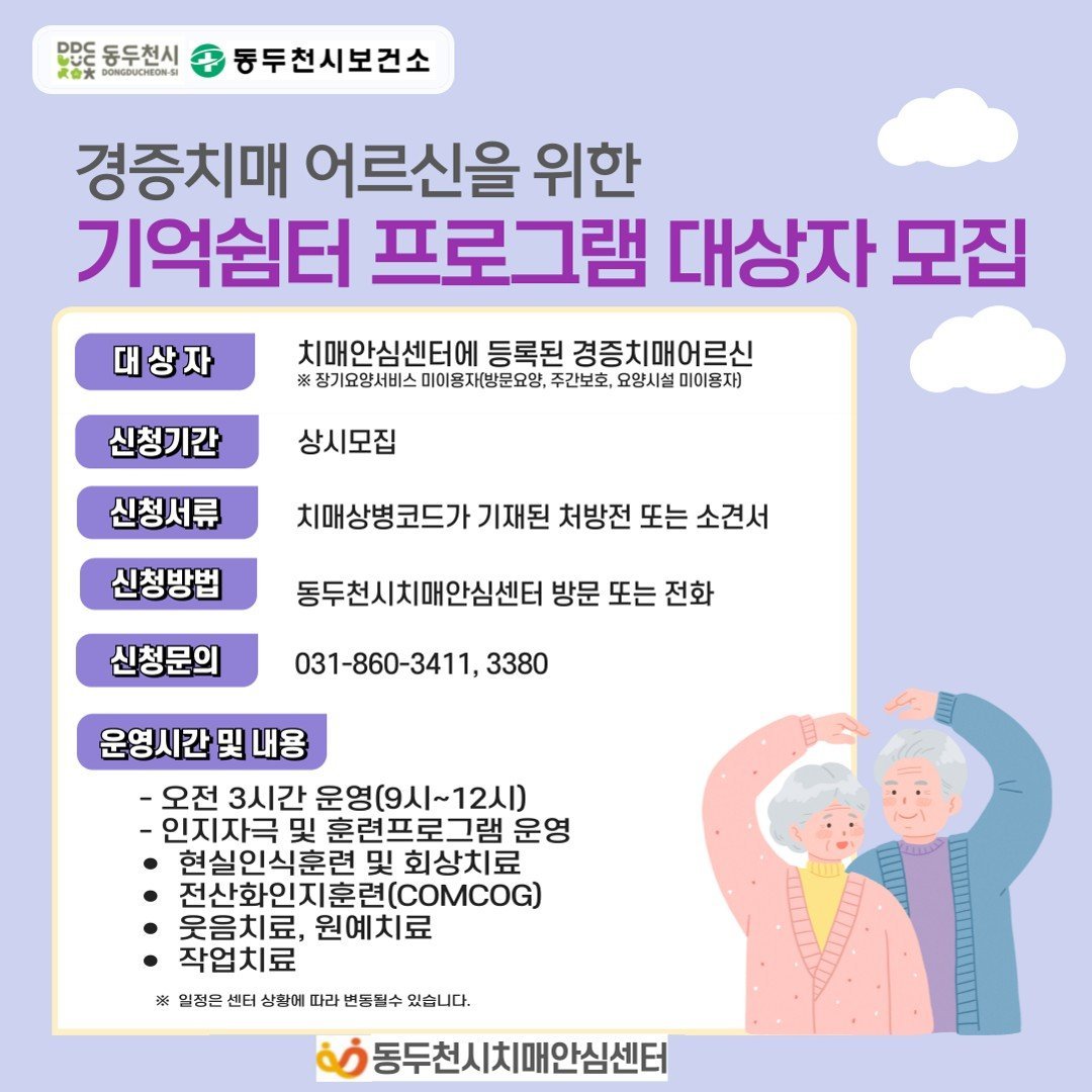 [한국Q뉴스] 동두천시치매안심센터는 경증 치매 환자를 대상으로 '기억쉼터 프로그램'1기 참여자를 모집한다고 밝혔다.