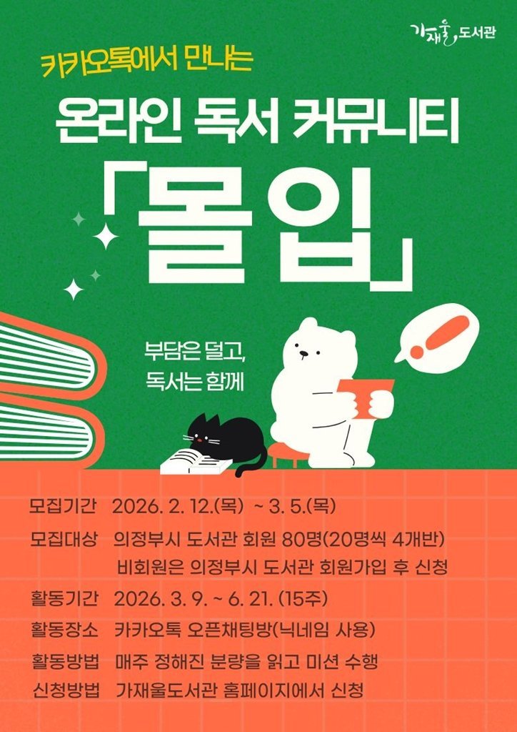 [한국Q뉴스] 의정부가재울도서관은 3월 9일부터 6월 21일까지 총 15주 동안 운영하는 온라인 독서챌린지 ‘몰입’의 8기 참여자를 모집한다.