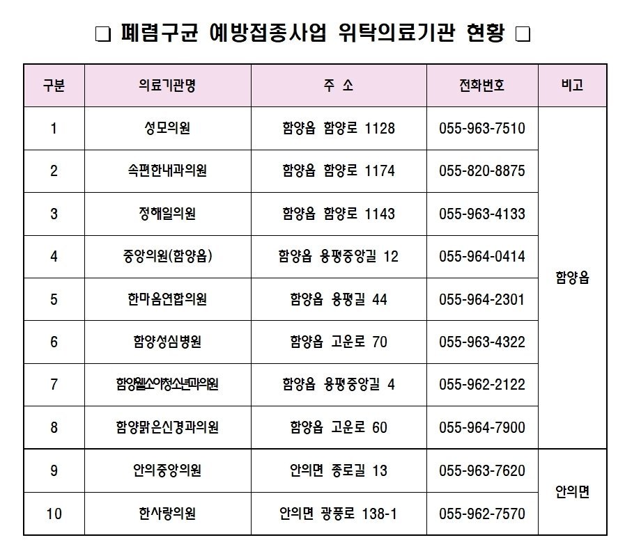기타 65세 이상 어르신 폐렴구균 무료 예방접종과 관련한 자세한 사항은 함양군보건소 예방접종실로 문의하면 된다.