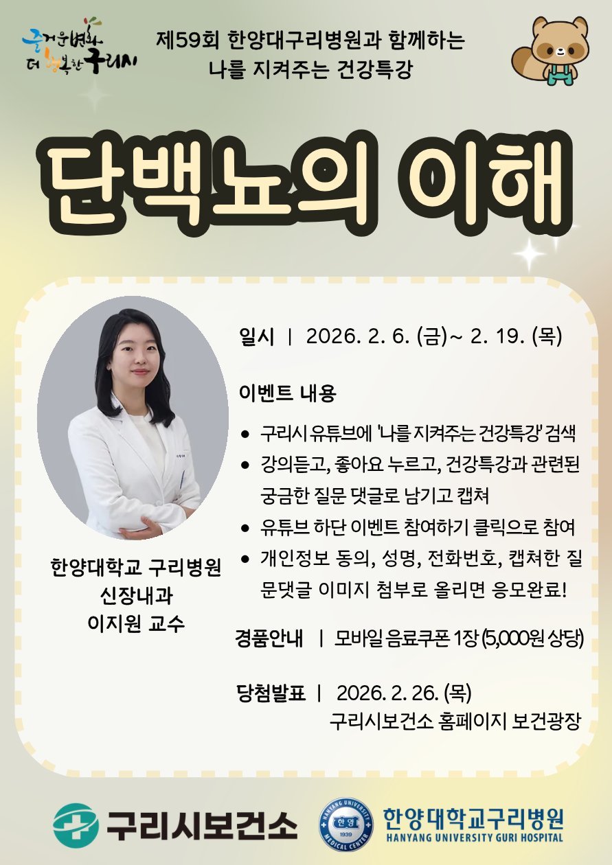 백경현 구리시장은 "단백뇨는 단순한 검사 결과로 넘기기보다 신장 건강을 점검하는 중요한 신호로 인식할 필요가 있다"며 "이번 유튜브 건강특강을 통해 시민들이 자신의 건강 상태를 이해하고 예방 중심의 건강관리를 실천하는 계기가 되길 바란다"고 말했다.