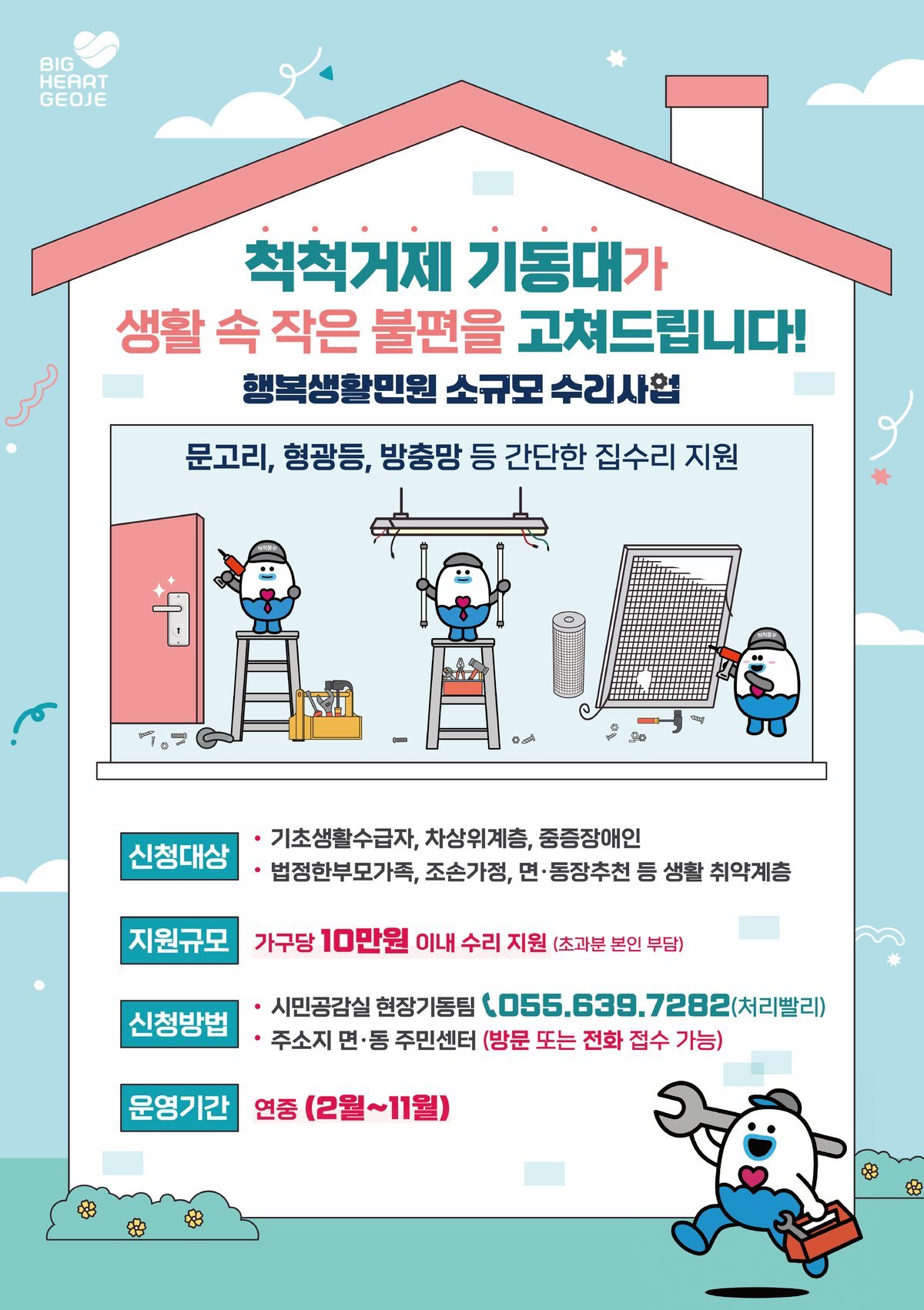 지원 내용은 문손잡이, 방충망, 형광등 교체 등 가정 내에서 발생하는 간단한 소규모 수리로 생활 불편을 신속히 해소해 시민의 주거환경 개선과 생활 안정에 도움을 주는 데 목적이 있다.