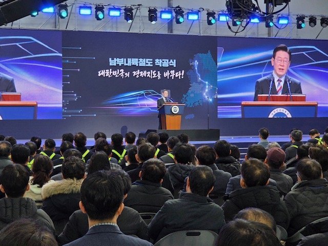 이날 착공식에 참석한 이재명 대통령은 기념사에서 "남부내륙철도는 단순히 선로 하나 놓는 사업이 아니다"며 "수도권에 모든 것이 집중된 일극체제에서 벗어나 사람과 지역을 잇고 기회를 연결하며 지역의 성장동력을 만들어내는 국토대전환의 시작"이라고 강조했다.