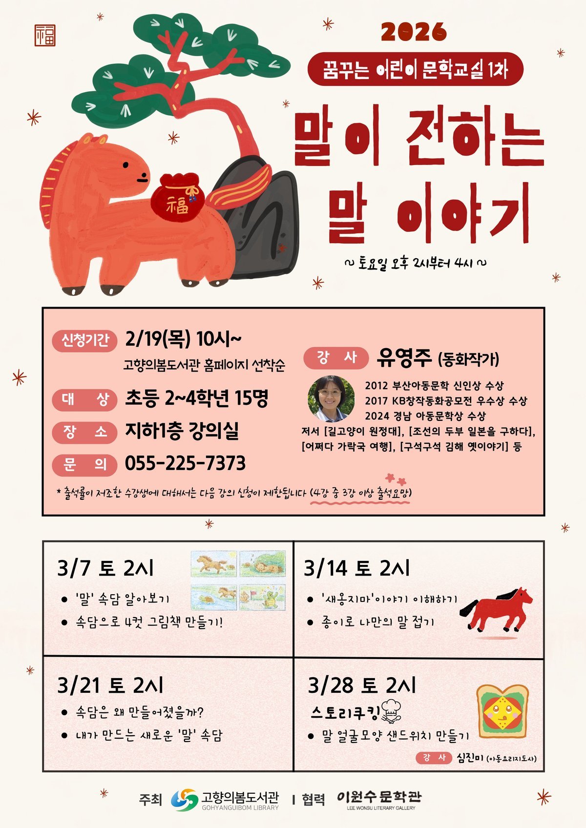 1차 강의는 3월 7일부터 4주간 매주 토요일 오후 2시에 진행되며 '말의 해'를 맞이해 '말'을 주제로 한 독서·창작 활동과 스토리쿠킹 체험이 함께 이루어진다.