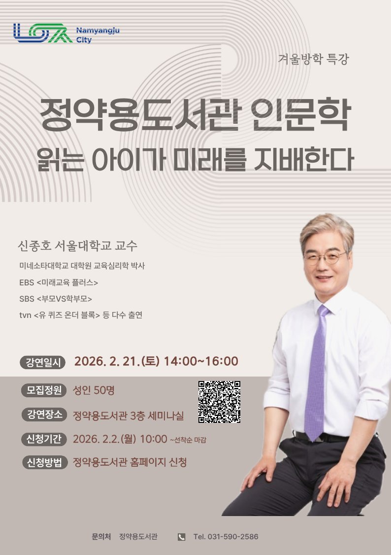 한편 정약용도서관은 시민의 삶에 도움이 되는 인문학 강연을 매월 셋째 주 토요일에 정기적으로 운영하고 있으며 다음 강연은 3월 21일 진행될 예정이다.