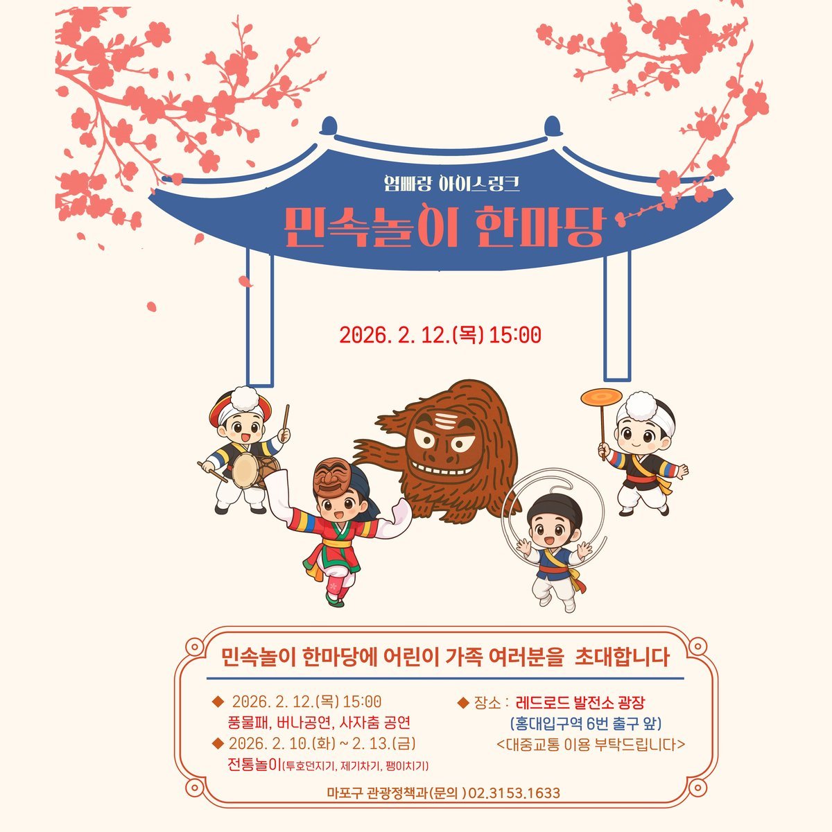 [한국Q뉴스] 마포구는 설 명절을 맞아 도심 속 아이스링크장에서 전통문화를 체험할 수 있는 '윈터페스타 엄빠랑 아이스링크–민속놀이 한마당'을 2월 12일 오후 3시, 레드로드 발전소 광장에서 개최한다.