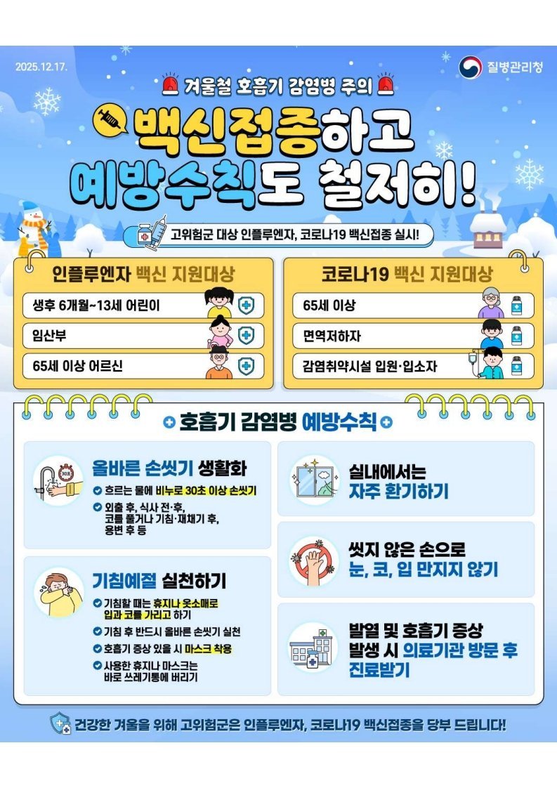 [한국Q뉴스] 문경시 보건소는 최근 인플루엔자 등 호흡기 감염병 발생 가능성이 증가함에 따라 시민들에게 개인위생 수칙 준수 및 예방접종 참여를 적극 당부했다.