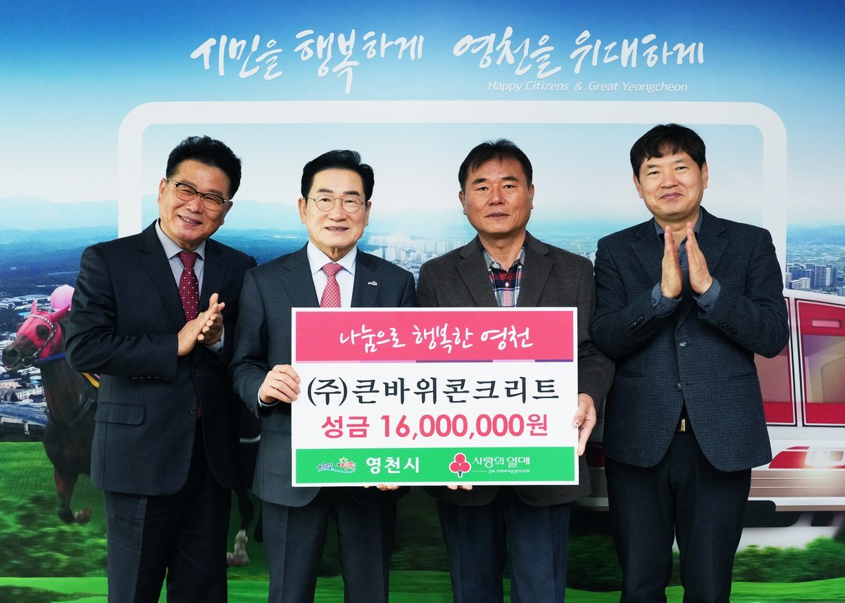 [한국Q뉴스] 영천시는 지난 9일 ㈜큰바위콘크리트에서 지역의 어려운 이웃을 돕기 위해 성금 1600만원을 기탁했다고 밝혔다.
