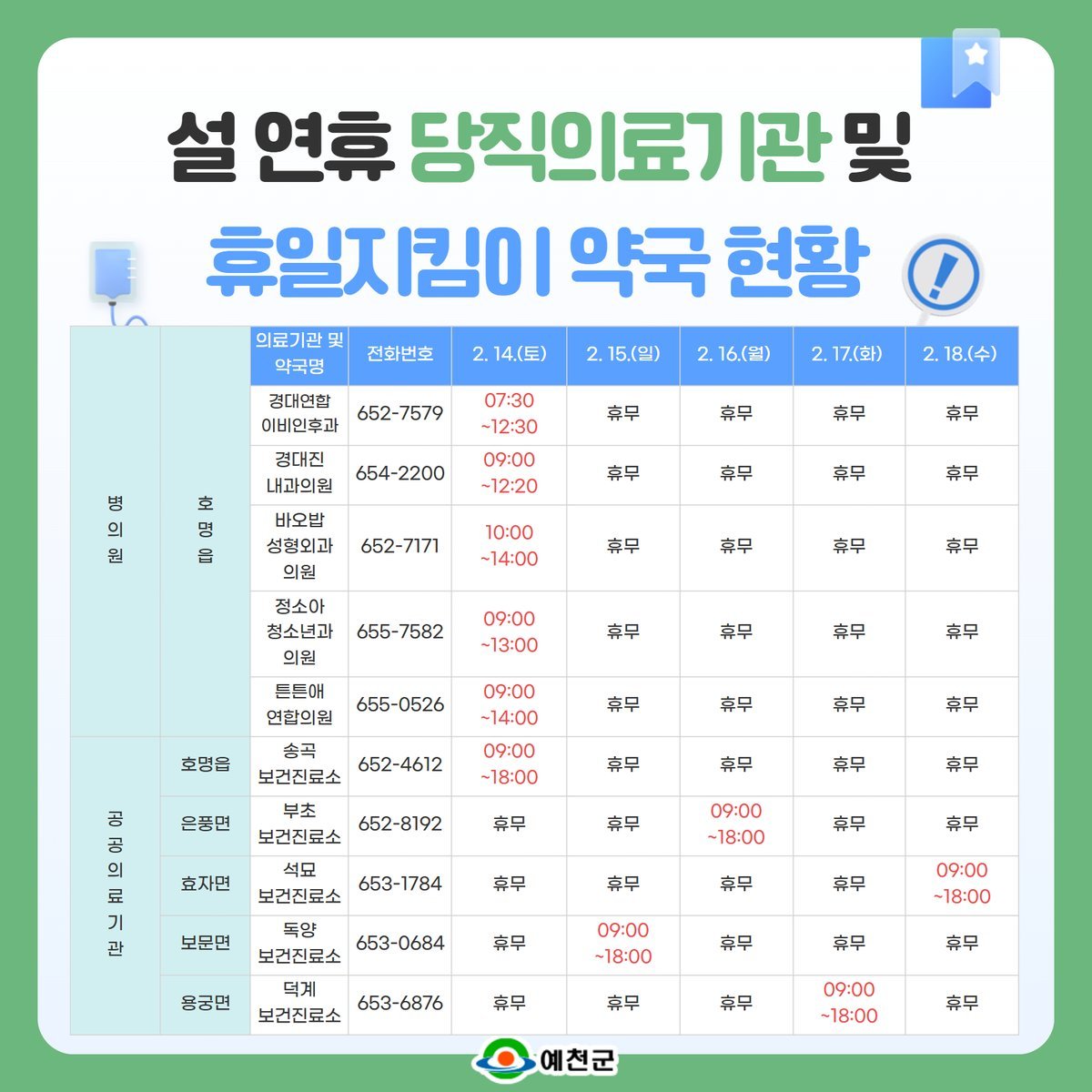 [한국Q뉴스] 예천군은 설 연휴 동안 관내 병․의원 당직의료기관과 휴일 지킴이 약국을 운영해 진료 편의와 응급진료 서비스를 제공한다.