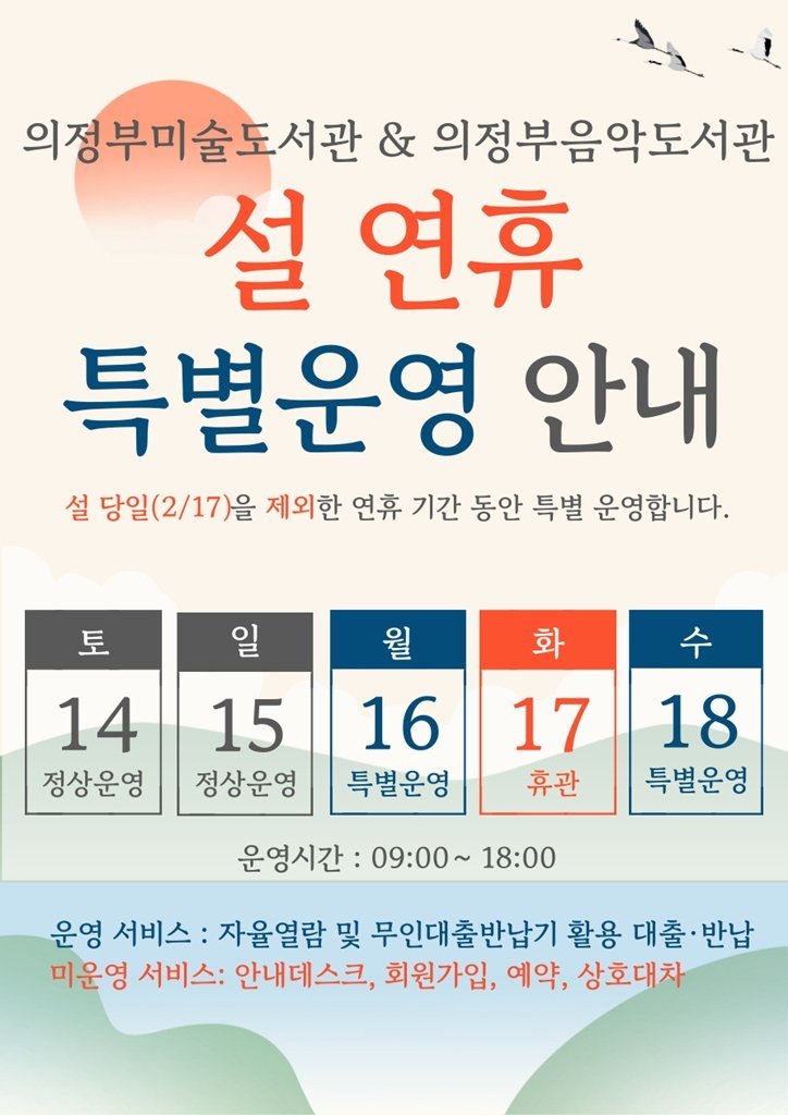 [한국Q뉴스] 의정부시는 2026년 설 명절을 맞아 시민과 귀성객들이 풍성한 연휴를 보낼 수 있도록 미술도서관과 음악도서관을 특별 운영한다.