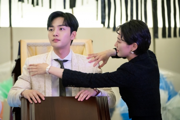 공개된 스틸에는 전시 오프닝 행사에서 관에 들어간 무학의 모습이 포착돼 시선을 강탈한다.