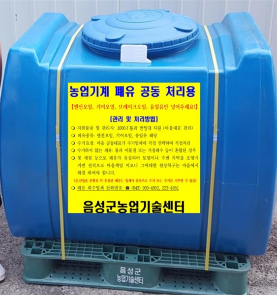 27일 군 농업기술센터에 따르면, 주민들이 공동으로 사용하는 폐유 수집 통이 노후하거나 훼손·분실한 마을을 대상으로 농업기계 폐유와 각종 윤활유 등 1천ℓ를 담을 수 있는 수집 통과 받침대를 보급한다.