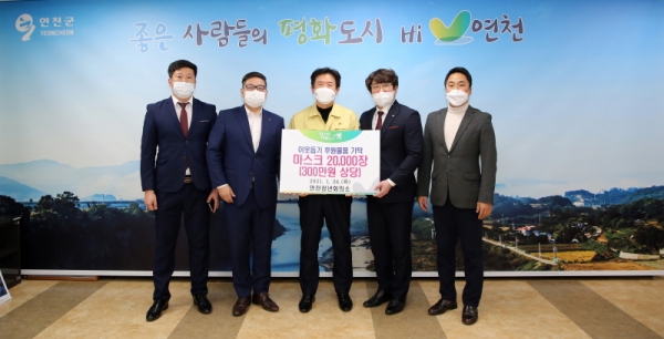 [피디언] 연천군 청년회의소는 지난 26일 연천군청을 방문해 코로나19 장기화로 인해 어려움을 겪고 있는 관내 취약계층을 위한 비말차단용 마스크 20,000장의 후원물품을 기탁했다.
