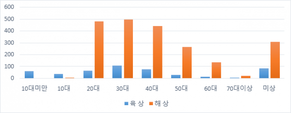 육상의 경우는 고른 분포를 보였으나 해상의 경우에는 주말보다 주중의 상담 요청이 상대적으로 많은 것으로 분석됐다.